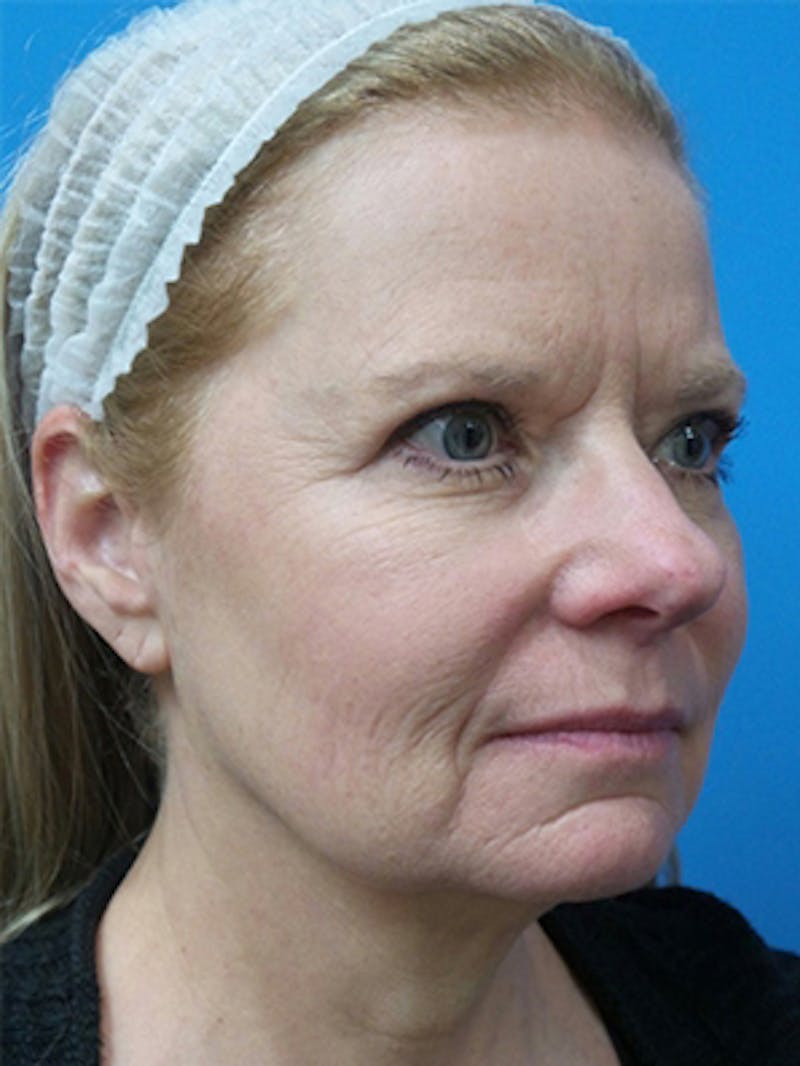 Treatment: Brow Lift/Facelift (patient had a retained suture removed over her sideburn in front of her left ear just before the photo was taken)/Chemical Peel to full face